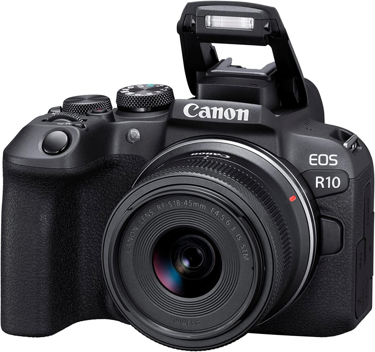 - Take advantage of the narrower field of view with the APS-C sensor to photograph distant subjects - Pick between 4K/60 fps for smooth motion and slow mo, or 4K/30 fps which oversamples 6K sensor data - Built-in WiFi makes it easy to transfer and upload photos and videos - The lightweight and compact design makes the R10 an ideal travel companion - It's made for all experience levels – use the guided interface or get stuck in with customisable controls - It's quick to respond to your actions thanks to the DIGIC X processor - Pre-shooting mode captures 0.5 seconds of action from before the shutter release button is pressed - A maximum sensitivity of ISO 32,000 (extendable to ISO 51,200) means more detail and less noise - Kit includes an 18-45 mm f/4.5-6.3 Lens with image stabilisation - perfect for travel
