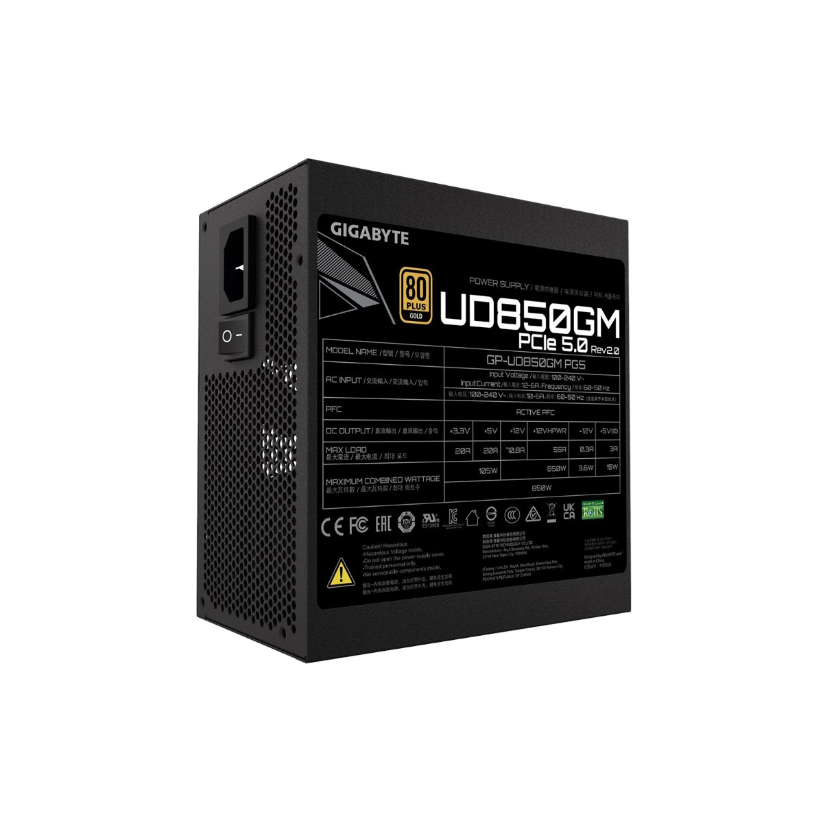 Model: GP-UD850GM PG5 V2 Type: Intel Form Factor ATX 12V v3.1 PFC: Active PFC (>0.9 typical) Input Voltage: 100-240 Vac (full range) Input Current: 15-6.5A Input Frequency: 60-50 Hz Output Capacity: 850W Dimensions: 150 x 140 x 86 mm Fan Type: 120mm Hydraulic Bearing(HYB) Fan 80 PLUS: Gold Efficiency: 90% at typical load MTBF: >100,000 hours Protections: OVP/OPP/SCP/UVP/OCP/OTP Power Good Signal: 100-150ms Hold Up Time: >16ms Cable Type: Embossed, All black Connectors: ATX/MB 20+4 Pin x 1 : 610mm*1 CPU/EPS 4+4 Pin x 2 : 650mm+200mm*1 PCI-e 6+2 Pin x 4 : 600mm+150mm*2 PCI-e 12+4 Pin x 1:700mm*1 SATA x 8 : 600mm+150mm+150mm+150mm*2 4 Pin Peripheral x 3+4-Pin Floppy x 1 : 500mm+150mm+150mm+150mm*1