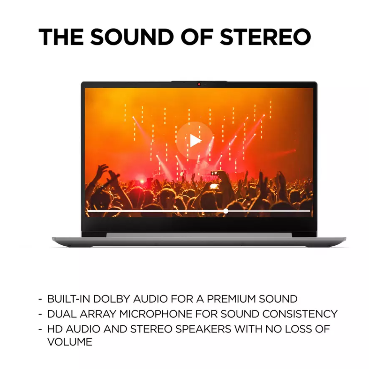 GREAT ENTERTAINMENT All your websites, movies and more come to life with the 15.6 inch Full HD display. Dolby Audio delivers crystal-clear sound whether you're watching a video, streaming music, or video-chatting, you're sure to love what you hear on the IdeaPad 3.
