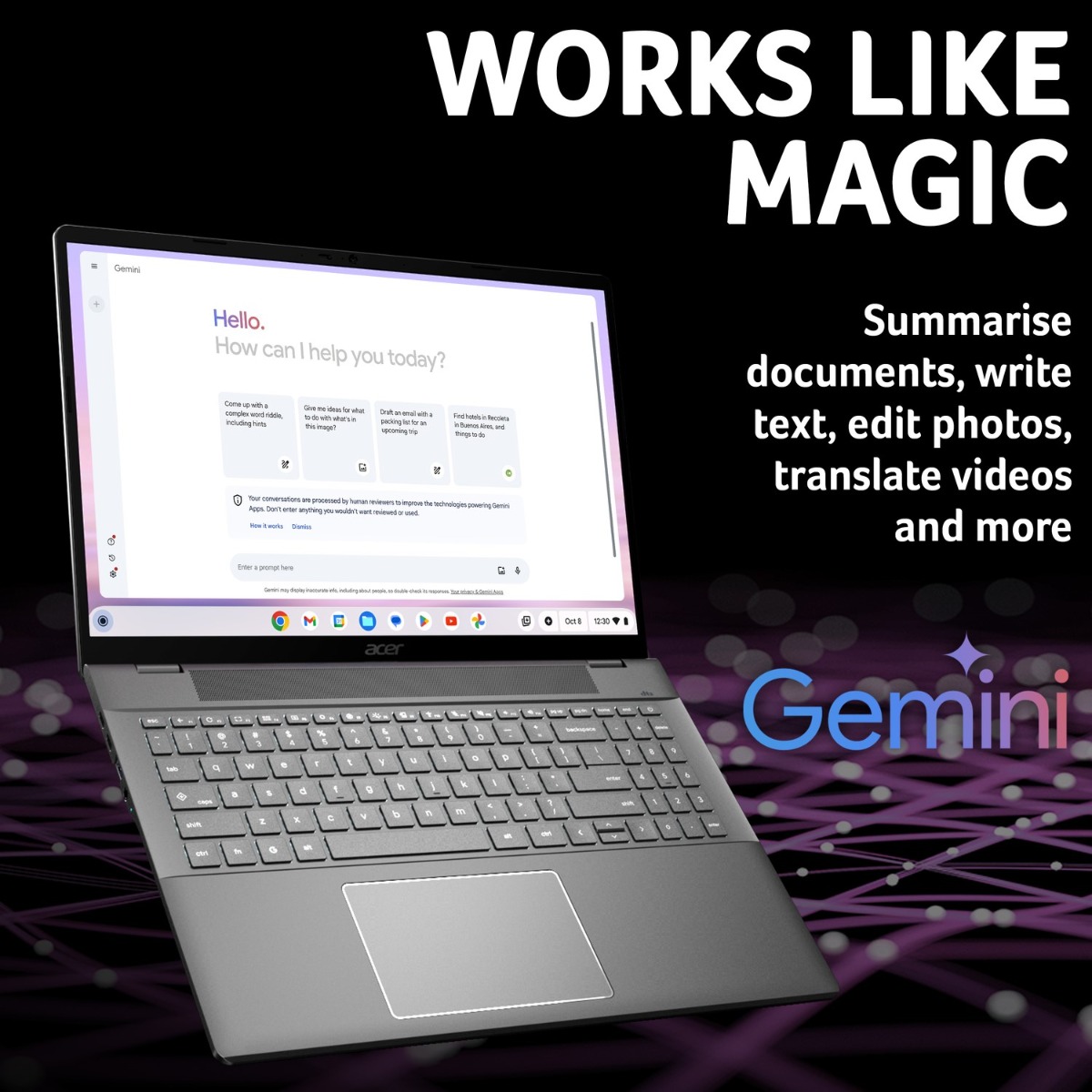 With double the speed, memory, storage and the power of Google AI, you can do more than ever before on Chromebook Plus. With the magic of Gemini, enhance how you read, write, and express yourself.