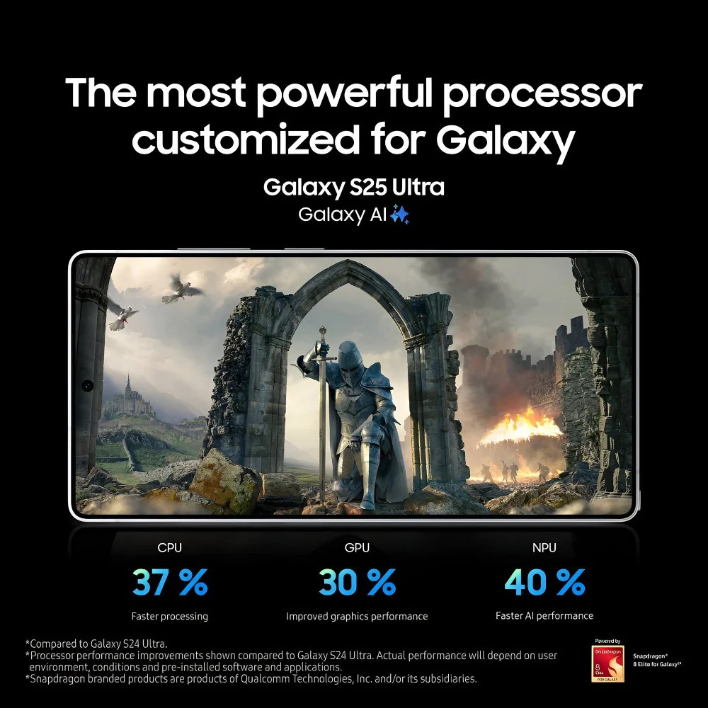 Powered by the Snapdragon 8 Elite chipset, the Samsung S25 Ultra 5G delivers 37% faster CPU speeds and 40% better AI performance. Experience real-time ray tracing, hardware-accelerated AI upscaling, ultra-responsive gaming and professional-grade multitasking.
