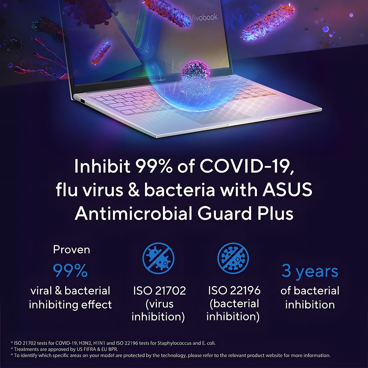 Inhibit 99% of COVID-19, flu virus & bacteria* ASUS Antimicrobial Guard Plus is applied to frequently touched areas of your laptop to help keep it hygienic. This technology uses a denser treatment* that inhibits viruses and bacteria. And it is scientifically shown — using the ISO 2170211 and 2219612 standards — to inhibit virus and bacteria growth by more than 99% over a 24-hour period4. Strains used for the tests include the SARS-CoV-2 (COVID-19), H3N2 (Influenza A) and the E. coli bacterium13. * ISO 21702 tests for COVID-19, H3N2, H1N1 and ISO 22196 tests for Staphylococcus and E. coli. * Treatments14 are approved by US FIFRA15 & EU BPR16.